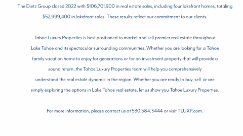 Change is the only constant in life. After two years of a COVID-fueled buying frenzy that produced stratospheric price spikes across all segments of the market, 2022 brought a bucket of icy lake water on the head. A dramatic reversal of economic conditions fueled by the Ukrainian conflict, historic interest rate hikes, a crypto collapse, and the erosion of equities rippled through Tahoe real estate. For the first time since COVID, we saw a noticeable lack of urgency as buyers were willing to wait on investing in vacation homes. By mid-summer, both supply and days-on-market had distinctly increased. Gone were the days of multiple offers within days of listing homes and the manic-ness we experienced since the pandemic onset. By the third quarter, we saw a palpable calm in luxury real estate sales. In fact, only 11 single-family lakefront homes between Rubicon Bay and Incline Village sold all year, the lowest we have seen since before our reporting began in 2006. Yet, median price has been slow to respond. As a result, in 2022, each micro-region (with the exception of lakefronts due to small sample size), saw median price reach historic highs, while sales volume decreased significantly. The disparity between median price and demand, alongside uncertain market conditions, continues to contribute to buyers willing to remain on standby, waiting for market corrections and for economic indicators to improve confidence. As sellers reset to the new normal, we expect buyers to start to again pull their paddles from beneath their chairs in 2023. For buyers who have been patiently awaiting value opportunities, 2023 should present well. While the selling environment is not as favorable as it has been over the past few years, sellers can still take advantage of the historic run-up in pricing from COVID. However, it will be imperative that sellers adjust expectations on pricing and time on market. As we close the chapter on the COVID-driven real estate binge, the winds of change will still blow in opportunities around Lake Tahoe.